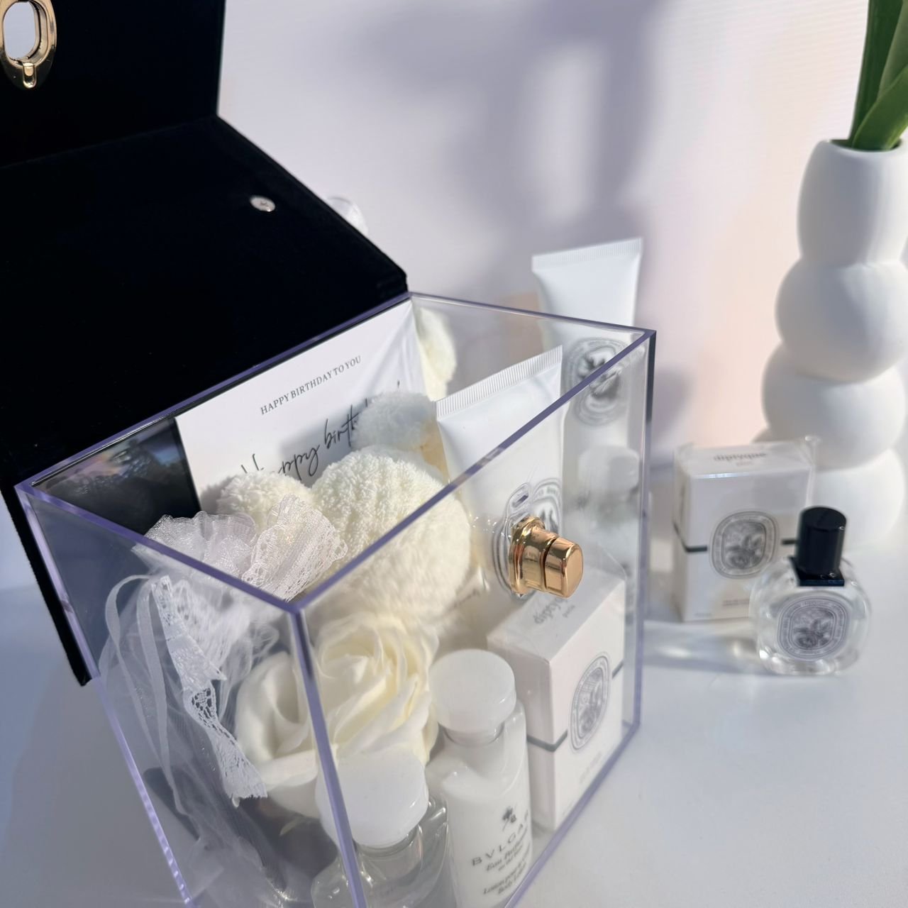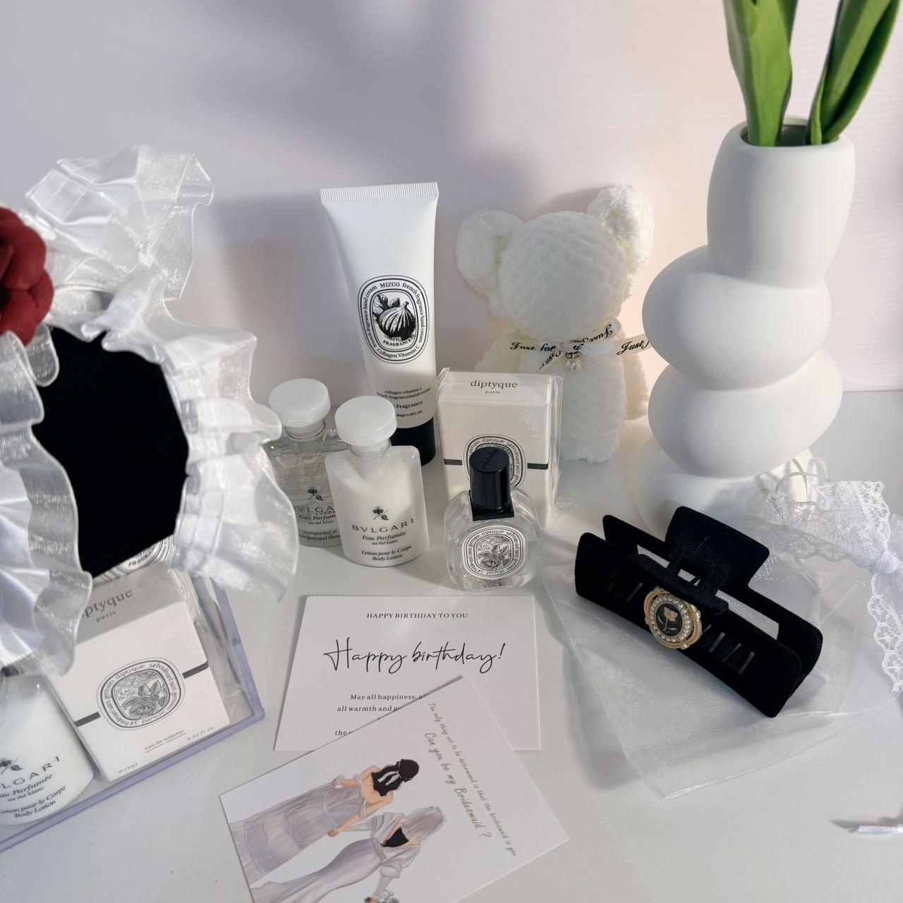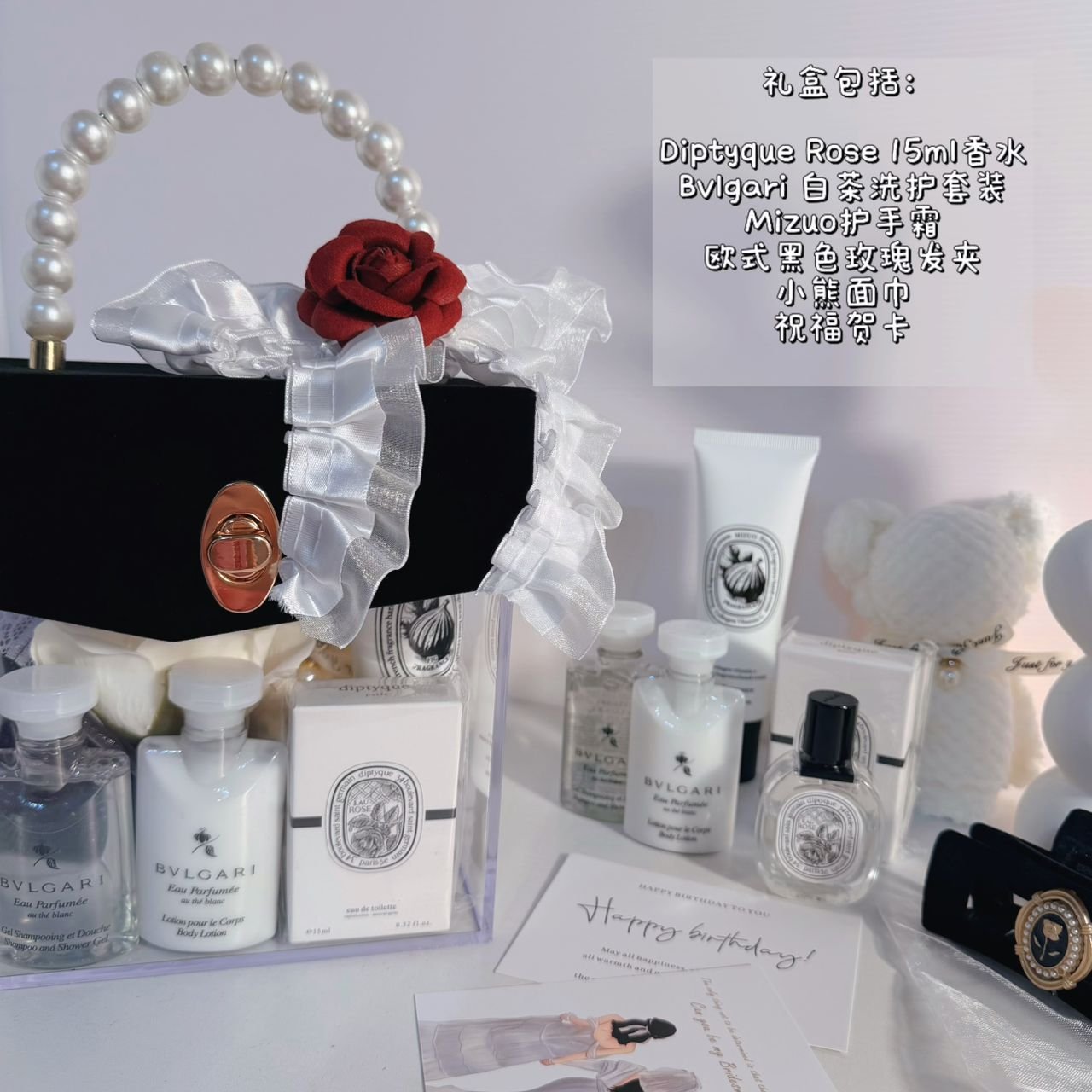 Diptyque Rose 15ml香水 Bvlgari 白茶洗护套装 Mizuo护手霜 欧式黑色玫瑰发夹 小熊面巾 祝福贺卡